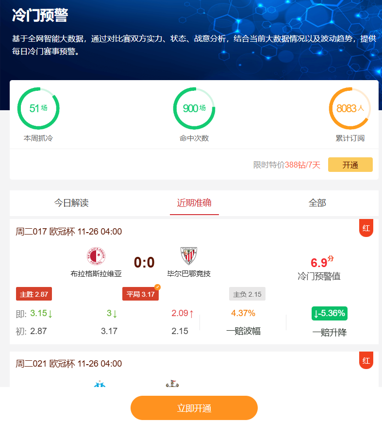 昨日欧冠布拉格斯拉维亚VS毕尔巴鄂竞技的比赛中,尽管初始赔率显示双方分出胜负的概率较大(胜平负赔率2.87:3.17:2.15),但比赛最终打出了0-0平的冷门。同时昨日也成功命中英冠沃特福德1-1平普雷斯顿、诺维奇1-1平牛津联、荷乙罗达JC1-2负多德勒支以及公推欧冠马赛2-1胜纽卡斯尔联。冷门预警:昨日命中八倍冷门!马赛能否借主场之利阻击纽卡?一众赛果充分展现了我们工具的精准预测能力。