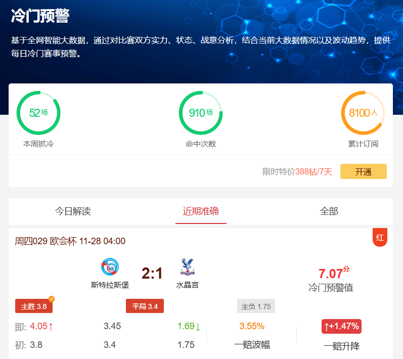 昨日欧会杯斯特拉斯堡VS水晶宫的比赛中,尽管初始赔率显示客队取胜的概率较大(胜平负赔率3.8:3.4:1.75),但比赛最终打出了2-1胜的冷门。同时欧会杯佛罗伦萨0-1负AEK雅典、里耶卡0-0平AEK拉纳卡、布拉迪斯拉发2-1胜巴列卡诺、克拉约瓦大学1-0胜美因茨以及欧罗巴杯比尔森胜利0-0平弗赖堡、卢多戈雷茨3-2塞尔塔、费耶诺德1-3负凯尔特人等8场比赛也同样命中。一众赛果充分展现了我们工具的精准预测能力。