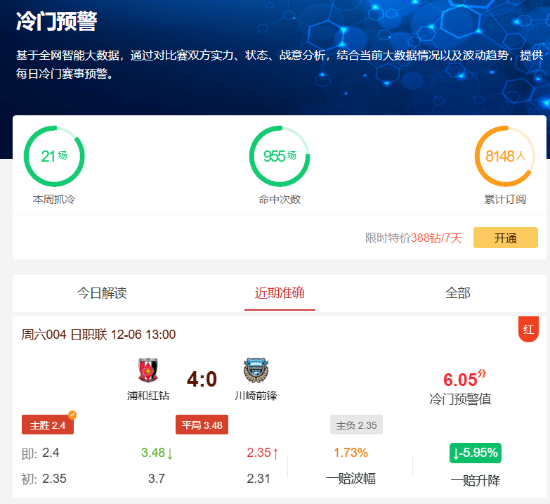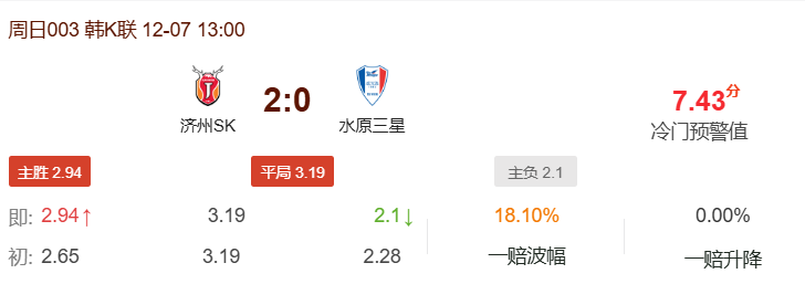 今日早场韩K联济州SKVS水原三星的比赛中,尽管初始赔率显示客队取胜的概率较大(胜平负赔率2.94:3.19:2.1),但比赛最终打出了2-0胜的冷门。昨日早场日职联浦和红钻4-0胜川崎前锋、京都不死鸟2-0胜神户胜利船、韩国杯光州FC1-1平全北现代等3场比赛也同样命中。一众赛果充分展现了我们工具的精准预测能力。
