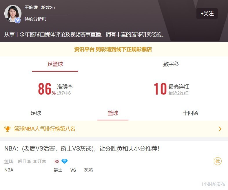 王施维7中6!今日篮球推荐已发车,速速点击查看