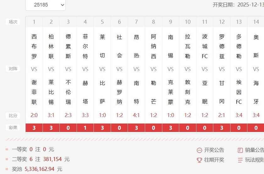 nba直播讯 北京时间12月13日,足彩第25185期开奖结果揭晓。