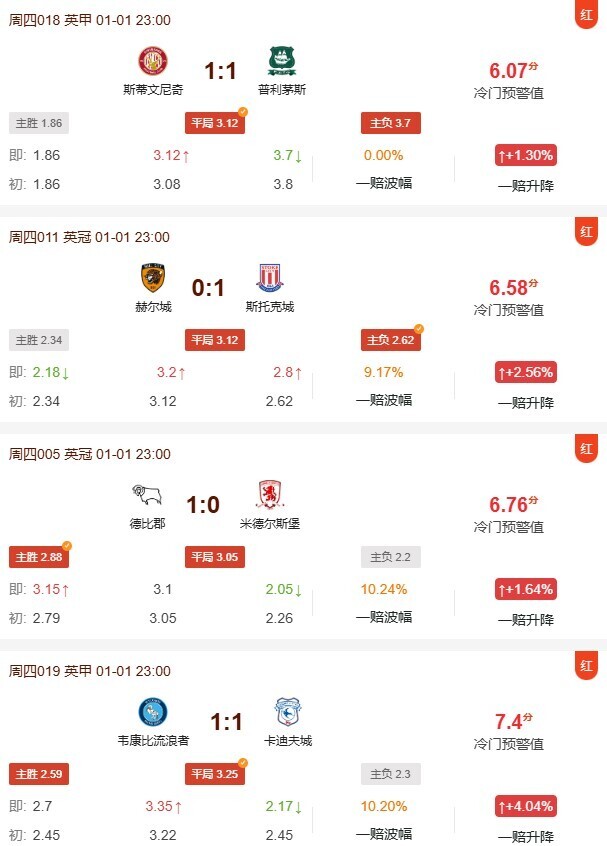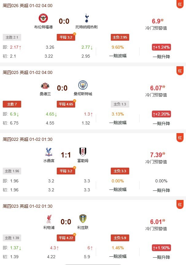 新年首日,我们的冷门预警工具精准锁定多场意外赛果,表现惊人特别优秀近20场预警命中16场,昨日英超四场平局全部捕获!包括: